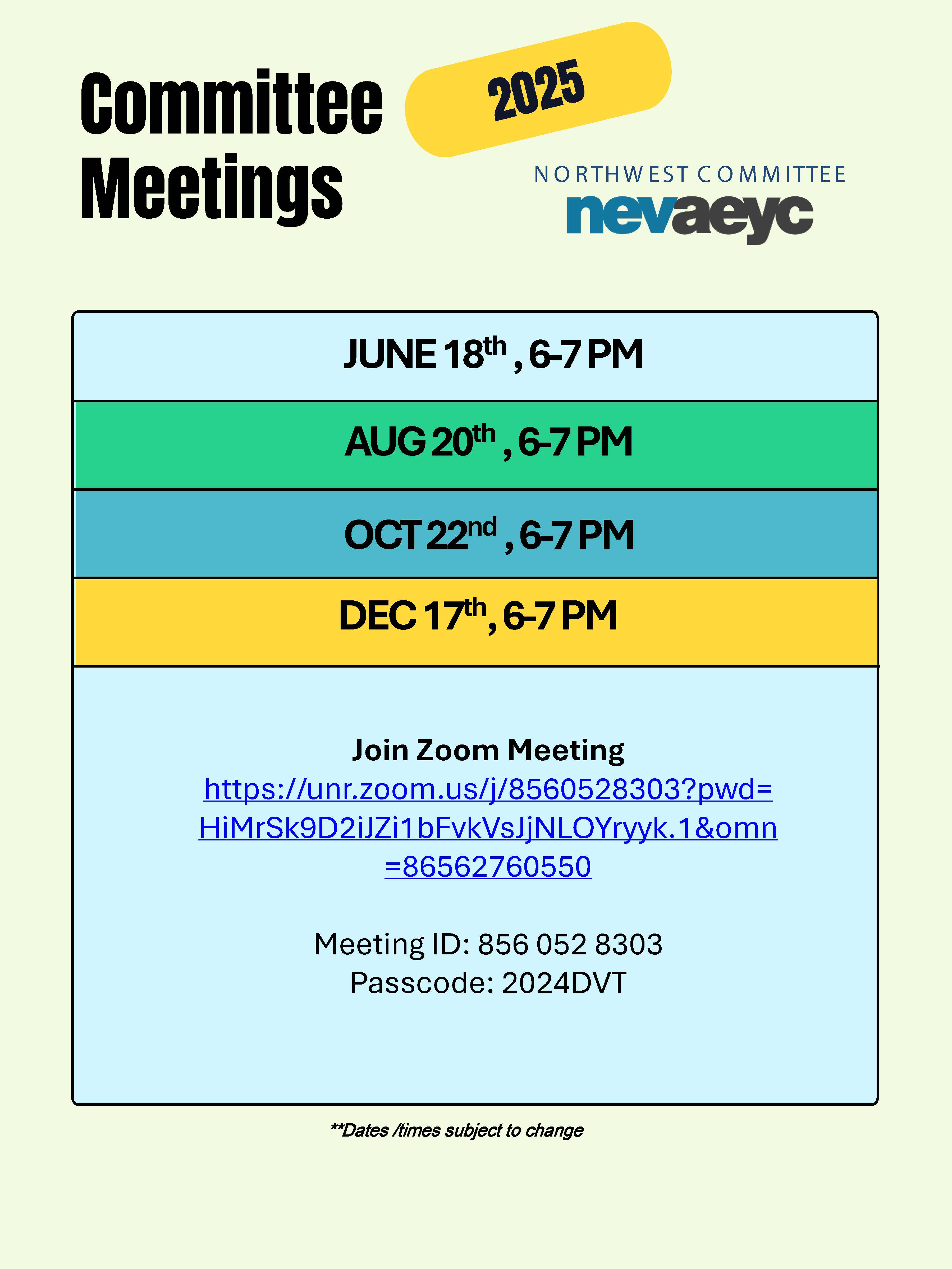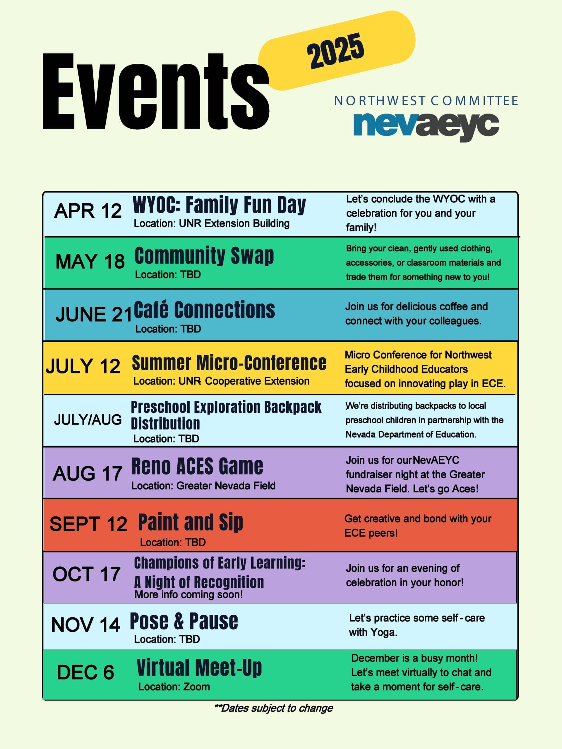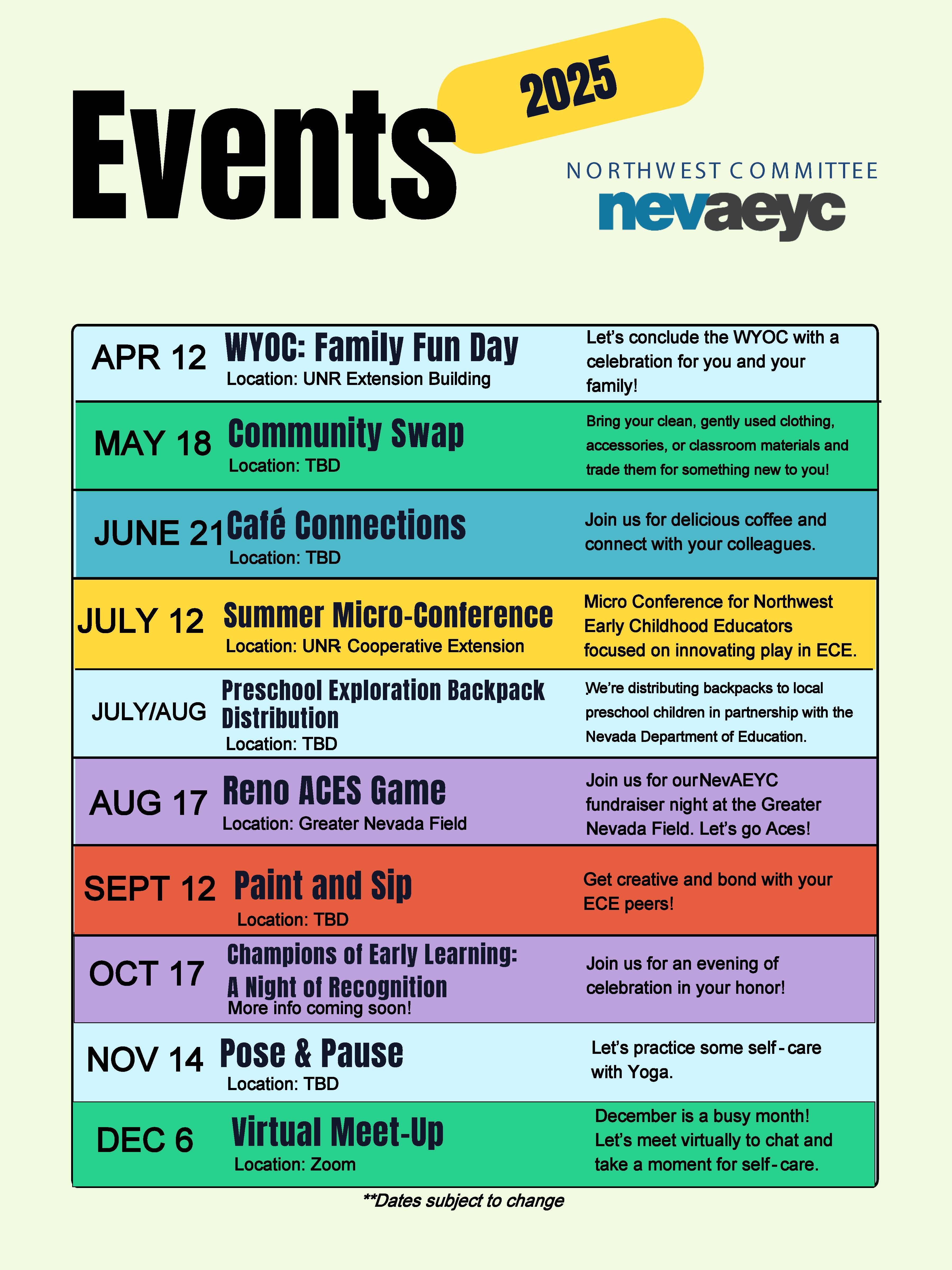 The NevAEYC Northwest Committee has planned an exciting set of events for our members this year! Take a look below at the events coming to the Northwest region: